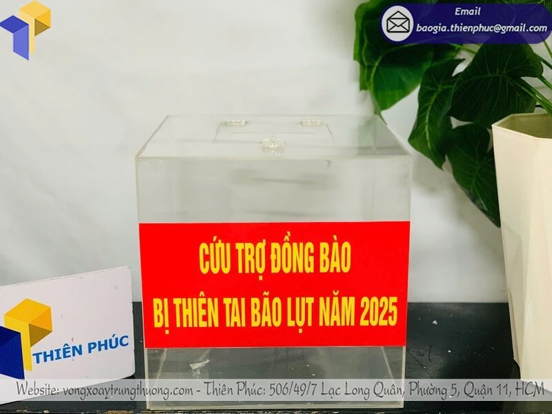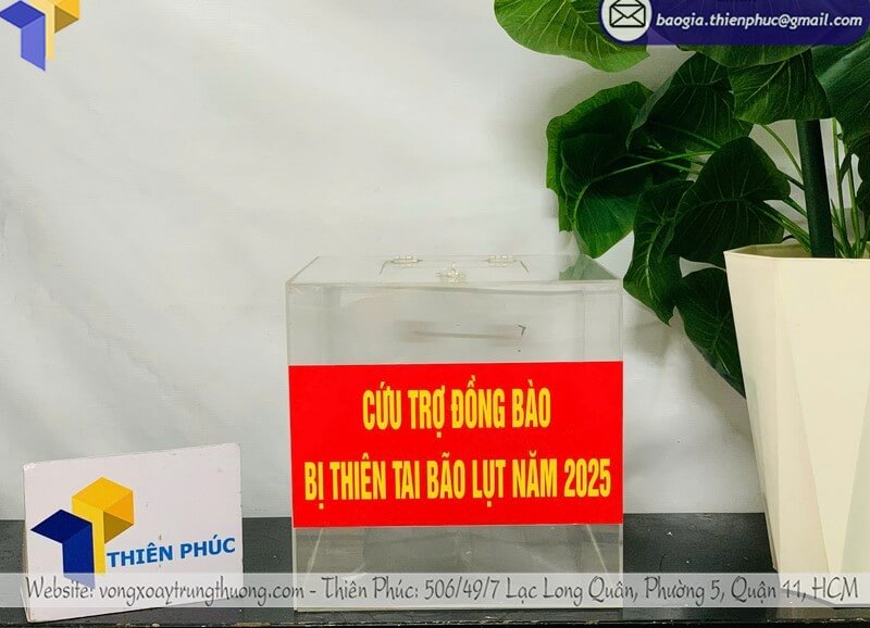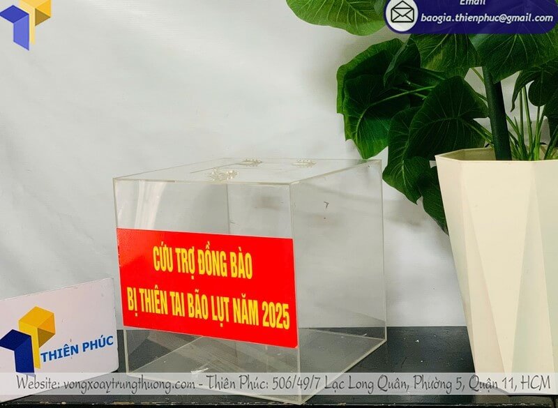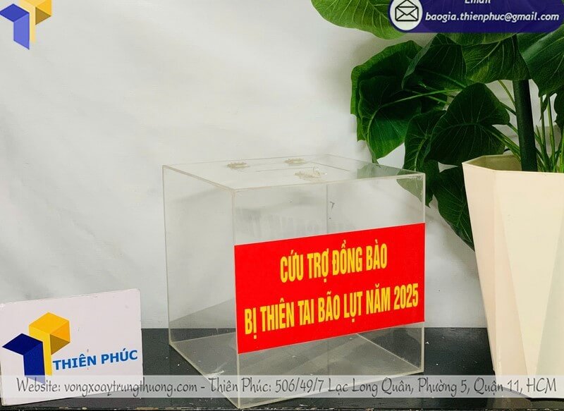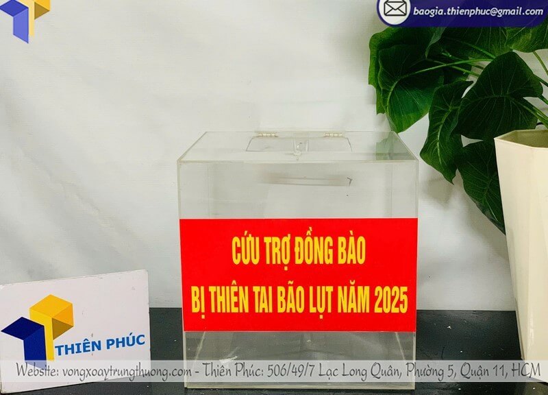 Tên sản phẩm: Báo giá gia công hộp quyên góp từ thiện mica cứu trợ đồng bào bị thiên tai 2025