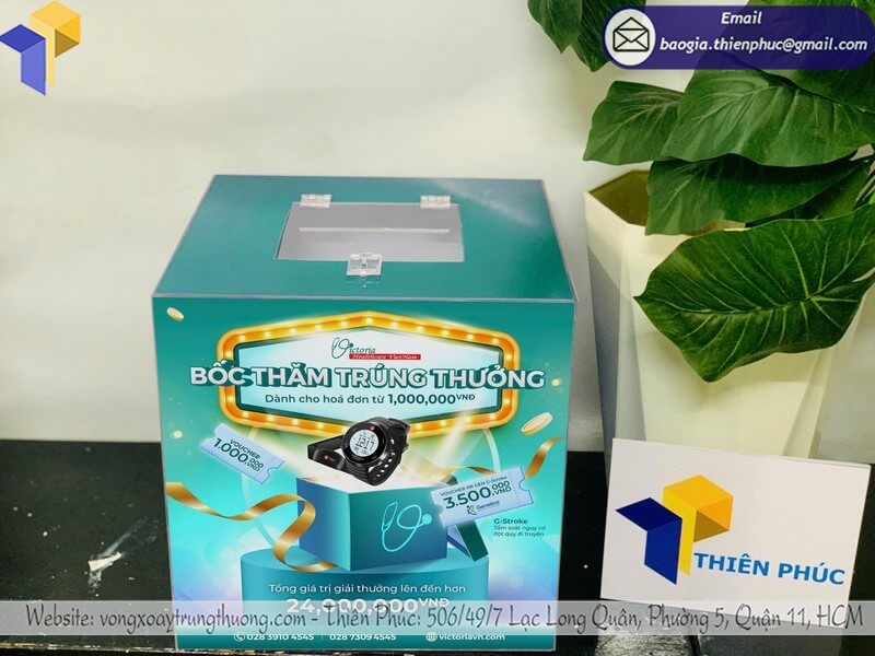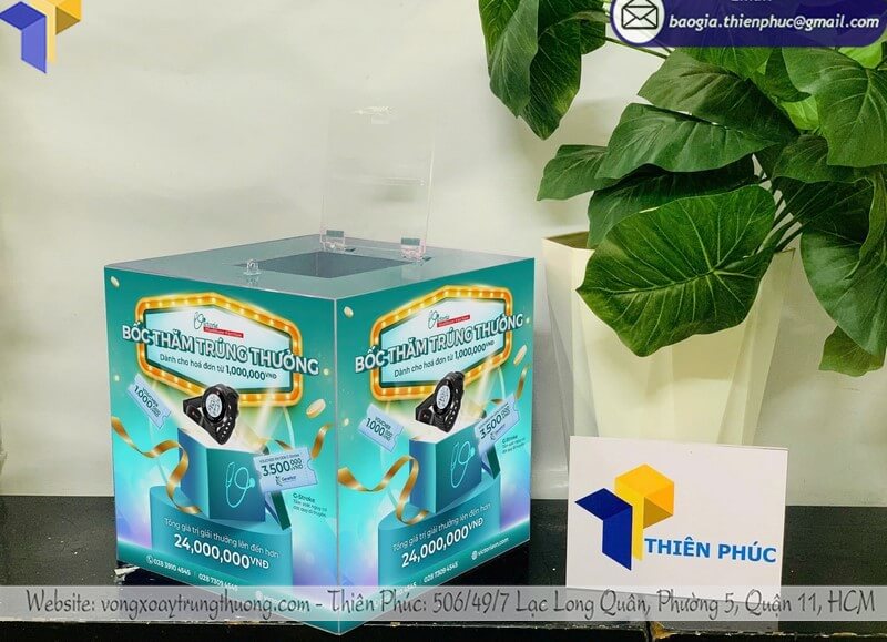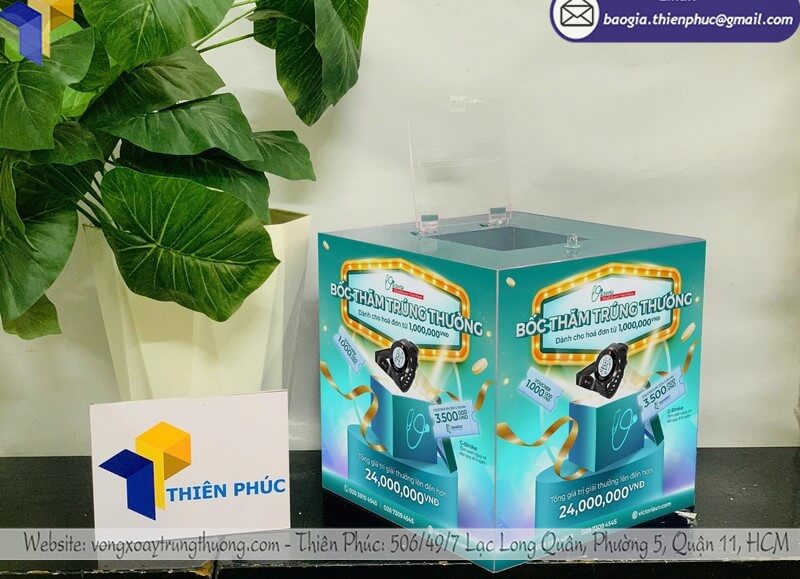 Báo giá hộp rút thăm may mắn mica trong minigame - Xưởng sản xuất - Công Ty Thiên Phúc gia công và thiết kế in ấn logo thương hiệu nhãn hiệu theo yêu cầu. Giá rẻ nhất dao động chỉ từ 480.000đ - 800.000đ/cái. Nhận đặt hàng số lượng lớn từ 10 cái trở lên. Tại xưởng chúng tôi có sẵn mẫu hộp chưa in logo, khách có thể đến mua trực tiếp.