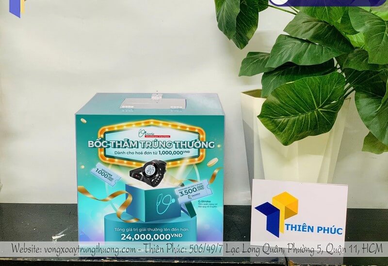 - Kích thước và mẫu mã sản phẩm: Hộp lớn, có tay quay hoặc kết hợp vòng xoay may mắn có chi phí cao hơn hộp nhỏ để bàn.