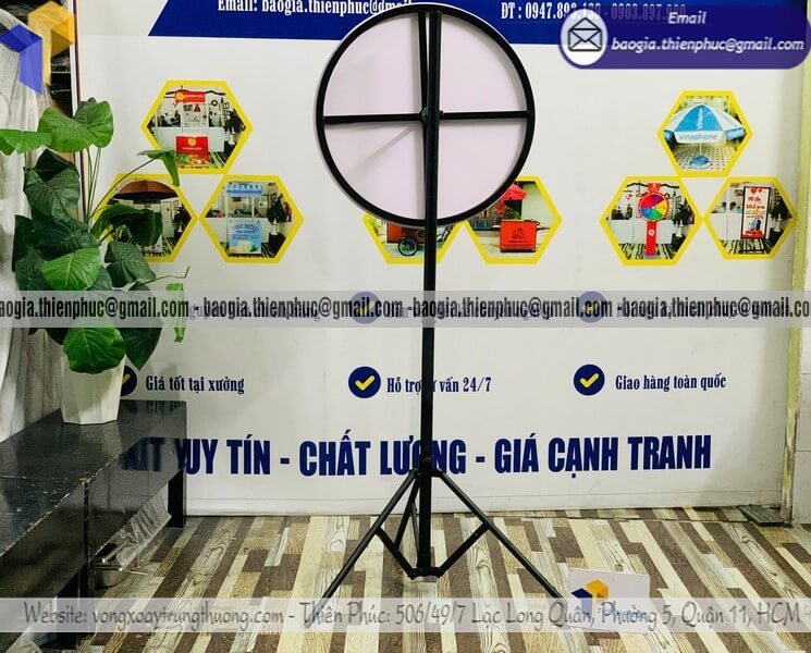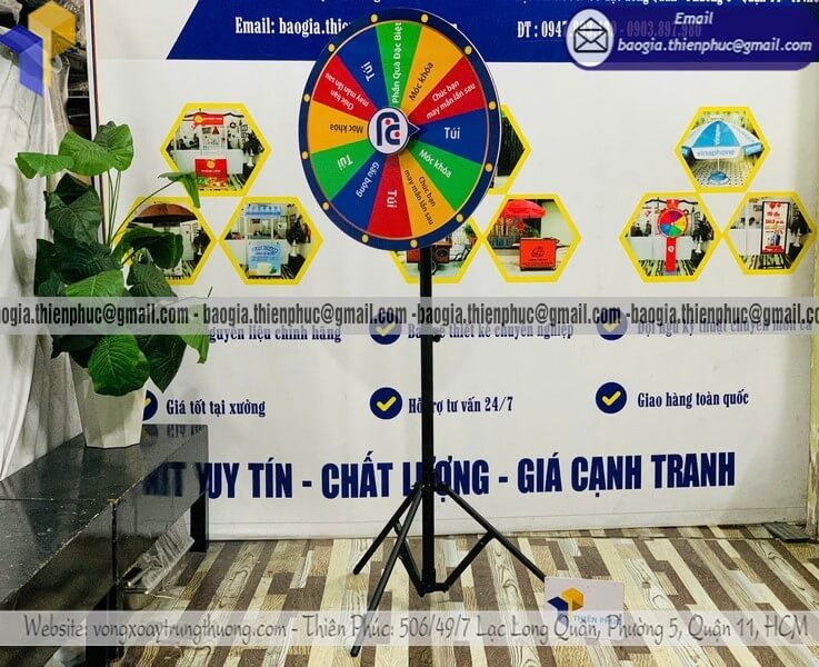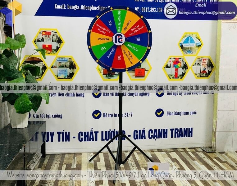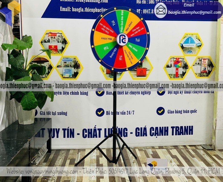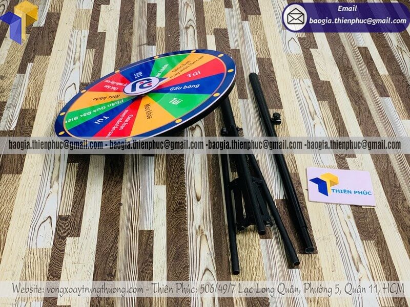 Báo giá vòng quay xoay thưởng in logo thương hiệu - Thiên Phúc là xưởng sản xuất & Công Ty chuyên gia công nhiều mẫu vòng quay xoay thưởng với nhiều kích thước và mẫu mã khác nhau. Thiết kế logo và in ấn theo yêu cầu khách hàng, thiết kế các ô quà tặng trúng thưởng miễn phí. Giá rẻ nhất thị trường chỉ từ 850.000đ/cái - 1.300.000đ/cái trở lên đối với mẫu vòng quay chân xếp đứng. Đặt hàng số lượng lớn chiết khấu ưu đãi. Liên hệ ngay Thiên Phúc để nhận được báo giá chi tiết và nhanh nhất. Giao hàng trên toàn quốc.