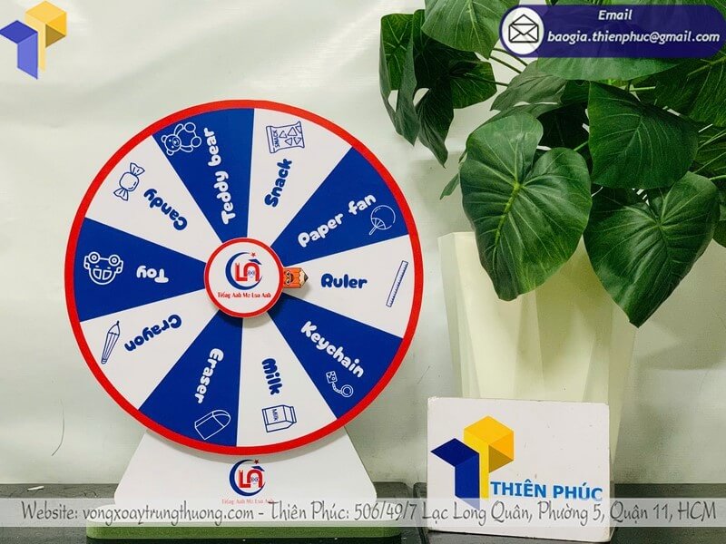 Tên sản phẩm: Báo giá vòng xoay gỗ để bàn trúng quà in logo cho event cho trường học nhãn hiệu Tiếng Anh Ms Lan Anh.