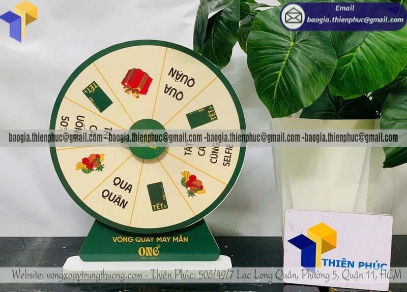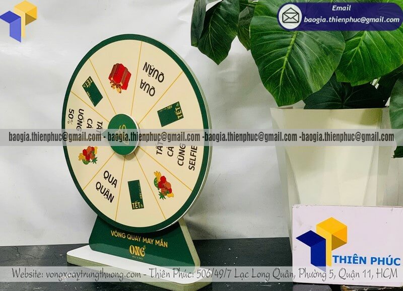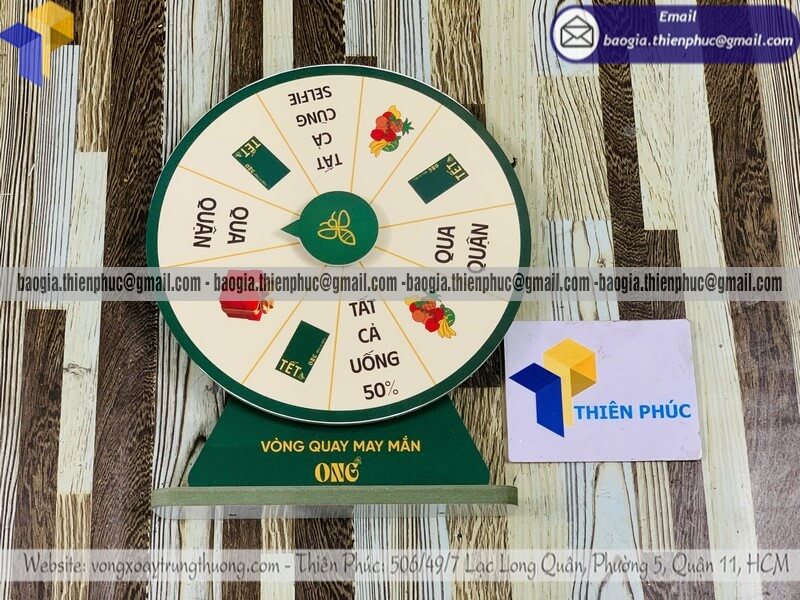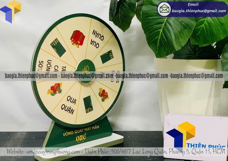 Báo giá vòng xoay nhỏ để bàn quay thưởng bằng gỗ - Xưởng sản xuất và Công Ty Thiên Phúc là xưởng chuyên cung cấp và gia công nhiều mẫu vòng xoay để bàn làm bằng gỗ có sẵn tại xưởng với đường kính phổ biến tại xưởng 30cm, 40cm. Thiết kế logo các ô quà tặng, nhãn hàng, thương hiệu miễn phí; theo yêu cầu khách hàng. Báo giá rẻ nhất - cạnh tranh nhất trên thị trường dao động chỉ từ 400.000đ/cái đến 600.000đ/cái trở lên. Hãy liên hệ ngay xưởng sản xuất Thiên Phúc để nhận được báo giá chi tiết nhất và nhanh chóng. Hỗ trợ xuất hóa đơn VAT cho doanh nghiệp, công ty.