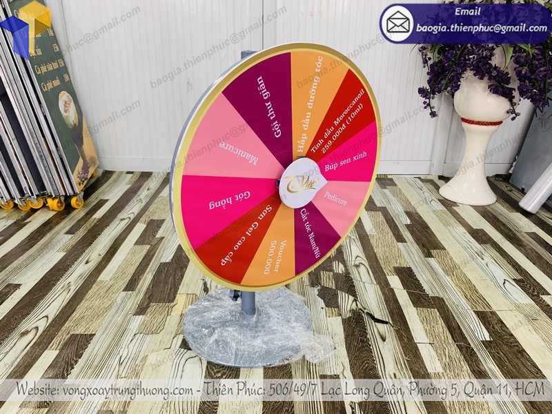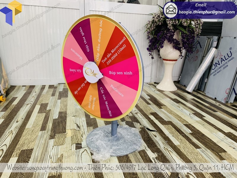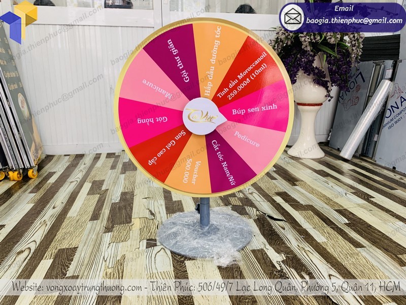 Công ty Thiên Phúc là nơi làm vòng quay giá rẻ tại TPHCM, chuyên gia công các loại vòng quay may mắn phù hợp với nhu cầu, kinh phí của khách hàng, đối tác. Thiên Phúc nhận làm vòng quay quảng cáo để bàn tại tất cả các quận huyện tại TPHCM và các tỉnh thành lân cận.