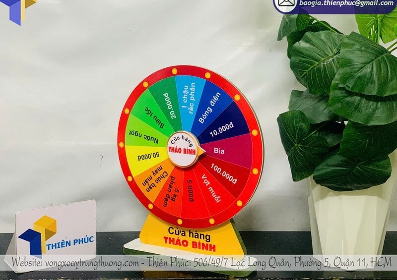 Với việc đặt làm vòng quay may mắn theo yêu cầu, doanh nghiệp có thể chọn kích thước, màu sắc, số lượng ô thưởng và hình ảnh minh họa phù hợp với từng loại sự kiện: từ lễ khai trương, hội chợ, triển lãm cho đến các chiến dịch khuyến mãi mùa lễ hội.