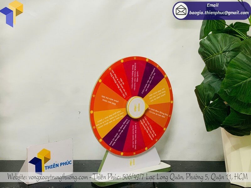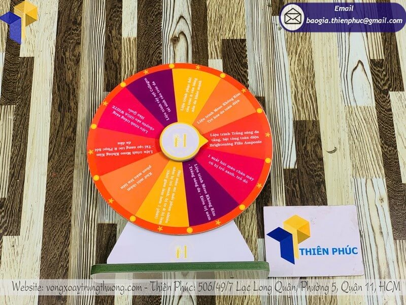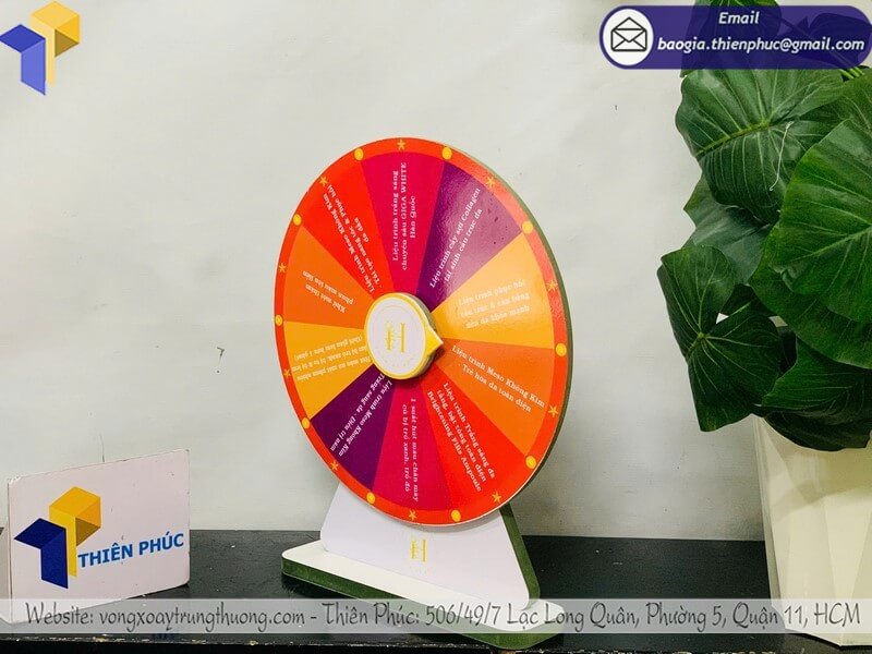 Đặt mua vòng xoay lucky draw bằng gỗ giá sỉ - Xưởng sản xuất Thiên Phúc có hơn 10 năm kinh nghiệm trong việc gia công và cung cấp nhiều mẫu vòng xoay bằng gỗ với đường kính 30cm, 40cm, đặt mua số lượng lớn giá chỉ còn trên 300.000đ - 500.000đ/cái. Hãy liên hệ với chúng tôi để được báo giá chi tiết hơn.