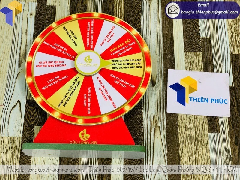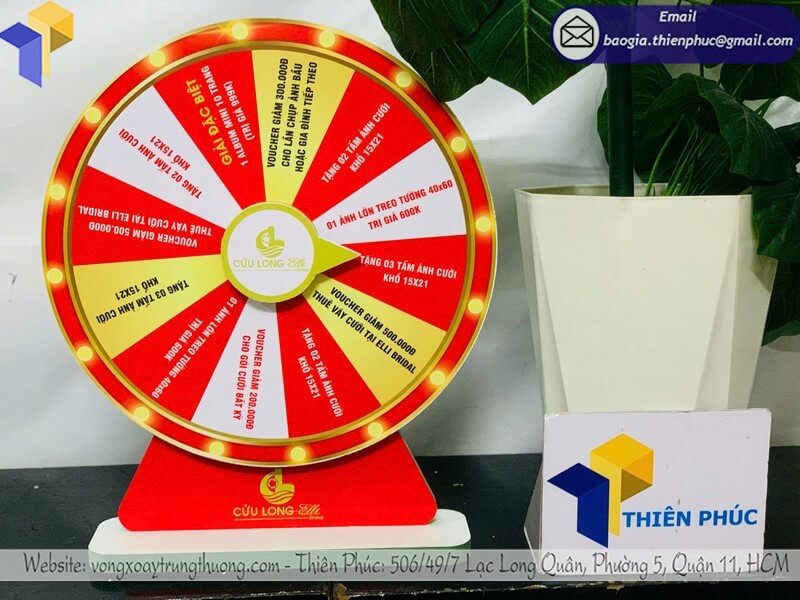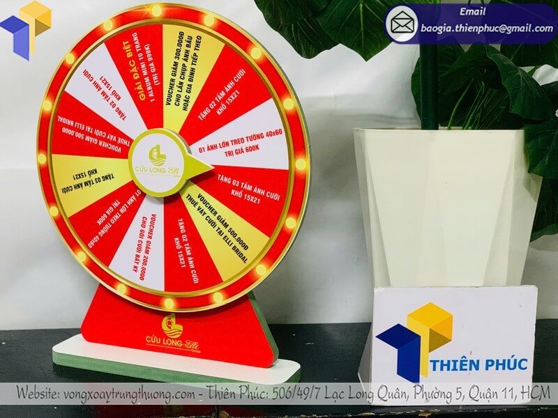 - Vòng quay: chia thành nhiều ô màu sắc bắt mắt, có thể in nội dung trúng thưởng hoặc thông điệp marketing.