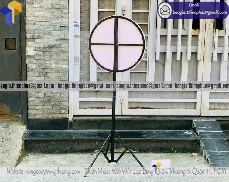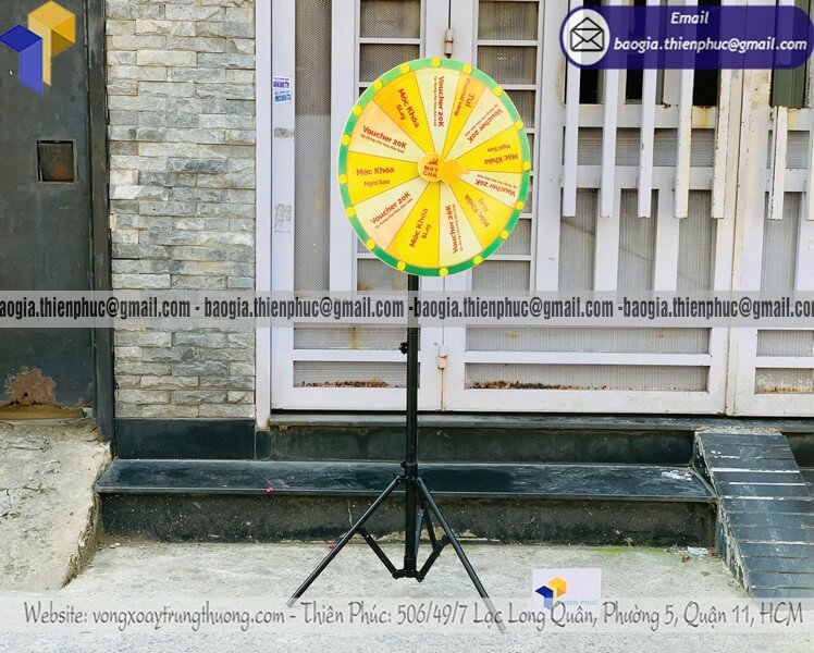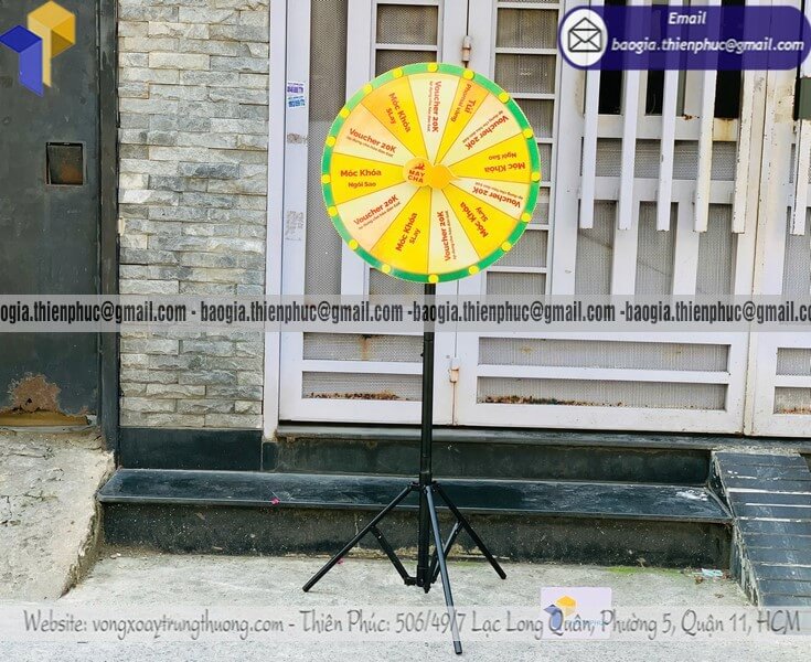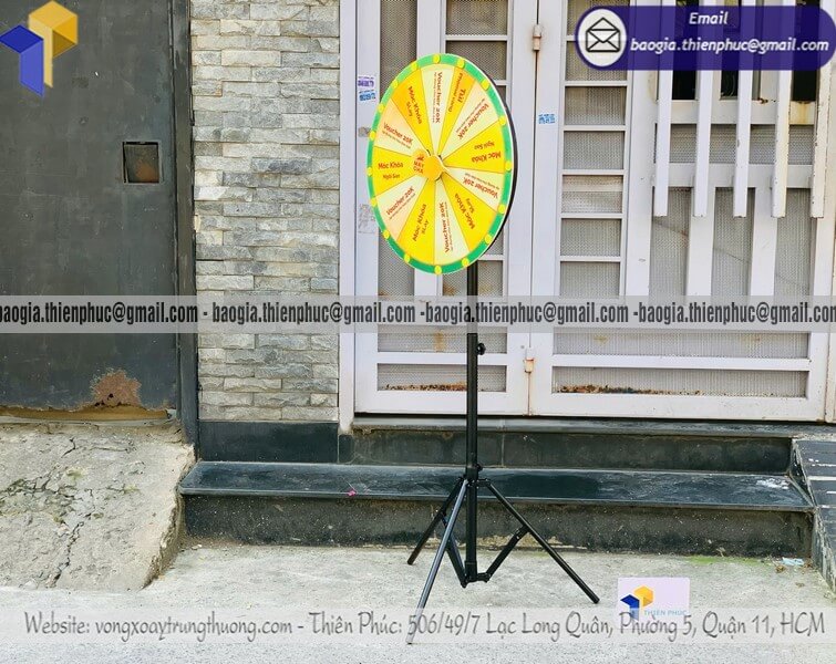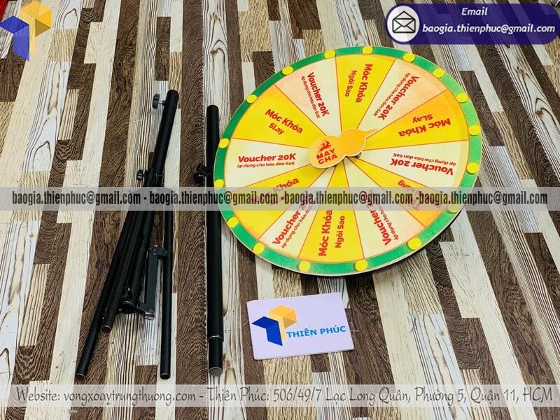Gia công vòng quay xoay thưởng may mắn tổ chức event - Xưởng sản xuất & Công Ty Thiên Phúc là xưởng chuyên nhận gia công nhiều mẫu vòng quay xoay thưởng với nhiều kích thước và mẫu mã khác nhau. Thiết kế logo và in ấn theo yêu cầu khách hàng, thiết kế các ô quà tặng trúng thưởng miễn phí. Giá dao động rẻ nhất thị trường chỉ từ 850.000đ/cái - 1.300.000đ/cái trở lên đối với mẫu vòng quay chân xếp đứng. Đặt hàng số lượng lớn chiết khấu ưu đãi. Liên hệ ngay Thiên Phúc để nhận được báo giá chi tiết và nhanh nhất. Giao hàng trên toàn quốc trong vòng 2-4 ngày.