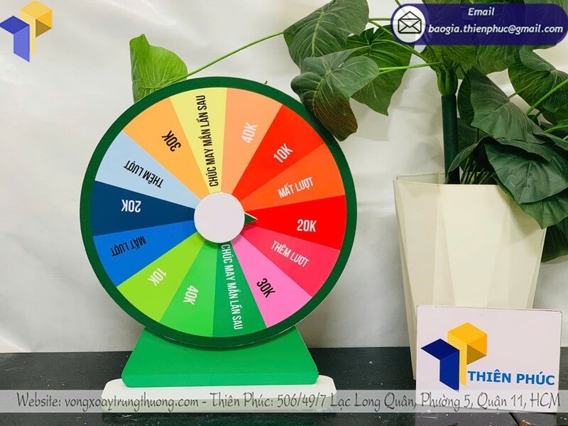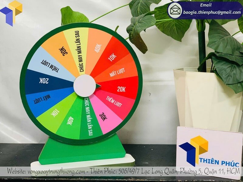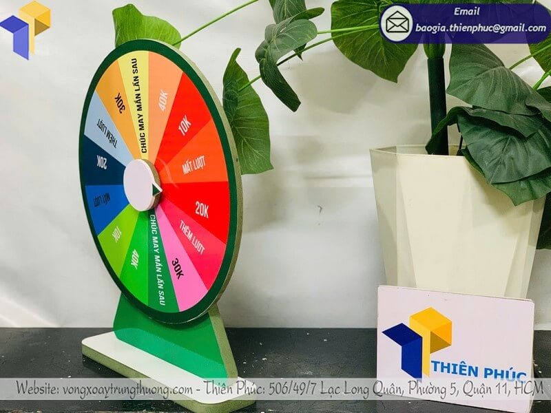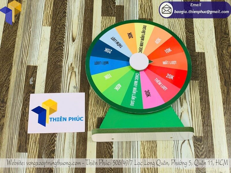Giá vòng xoay số bằng gỗ để bàn trúng giải rẻ - Xưởng sản xuất & Công Ty Thiên Phúc chuyên nhận sản xuất và cung cấp mẫu vòng xoay may mắn để bàn bằng gỗ với đường kính 30cm, 40cm với thiết kế logo hoàn toàn miễn phí, thiết kế các ô quà tặng giải thưởng theo yêu cầu khách hàng. Hỗ trợ xuất hóa đơn đỏ VAT doanh nghiệp, công ty. Đơn hàng từ 10 cái trở lên được chiết khấu cực ưu đãi. Dao động với giá cạnh tranh nhất thị trường chỉ từ 400.000đ/cái - 600.000đ/cái trở lên (chưa tính các chi phí phụ đi kèm)