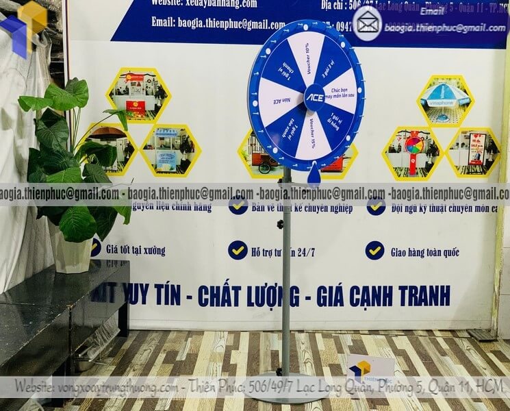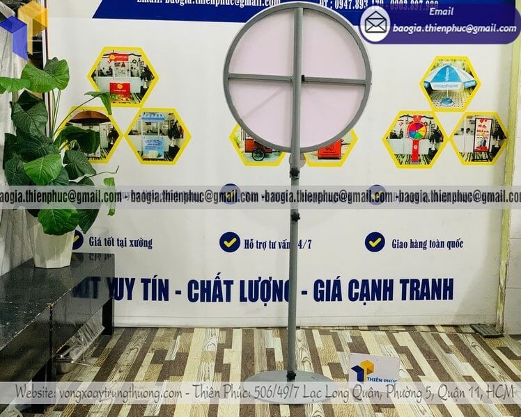 In vòng quay xoay thưởng lớn may mắn tổ chức sự kiện - Xưởng Thiên Phúc là xưởng sản xuất chuyên nhận đặt hàng và gia công nhiều mẫu vòng quay xoay thưởng may mắn sự kiện. Với nhiều kích thước, mẫu mã khác nhau. Giá rẻ nhất dao động chỉ từ 800.000đ - 1.300.000đ/cái trở lên đối với mẫu vòng quay đế tròn đứng. Đặt hàng số lượng lớn từ 10 cái trở lên được ưu đãi. Liên hệ với chúng tôi để được báo giá chi tiết - tư vấn mẫu mã.