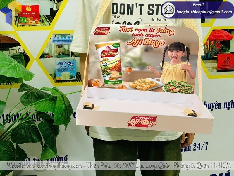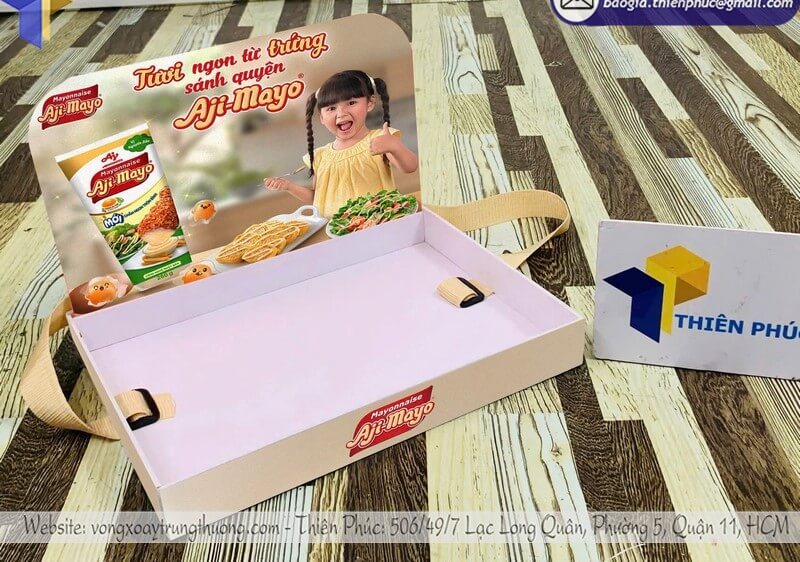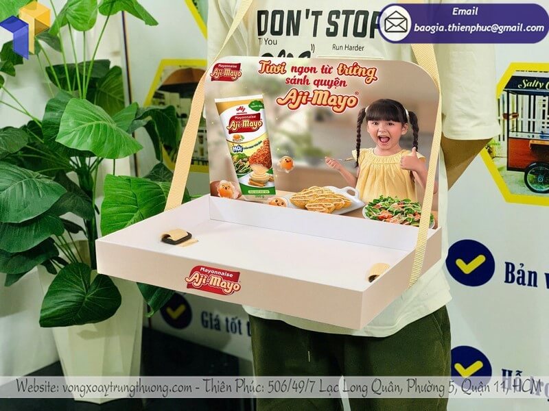 Khay đựng mẫu trưng bày đeo vai hoặc cầm tay phù hợp với nhiều bối cảnh khác nhau: từ điểm bán, sự kiện, hội chợ đến hoạt động quảng bá ngoài trời. Sự linh hoạt này giúp nhãn hàng chủ động hơn trong kế hoạch marketing, không bị phụ thuộc vào không gian hay hình thức tổ chức.