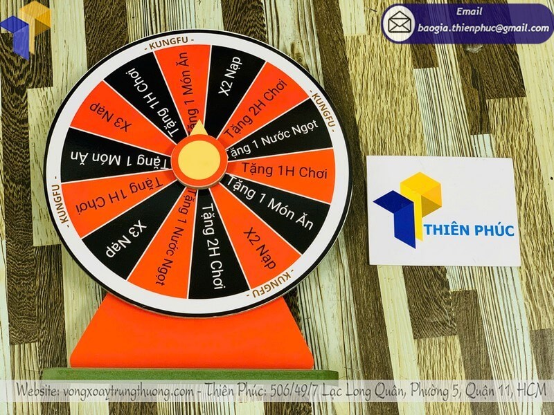 Xưởng hỗ trợ in logo, tên thương hiệu, slogan hoặc màu sắc theo nhận diện công ty, giúp vòng xoay không chỉ là trò chơi mà còn trở thành công cụ marketing hiệu quả.