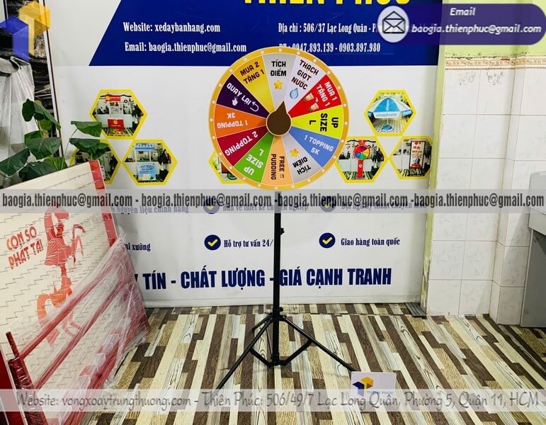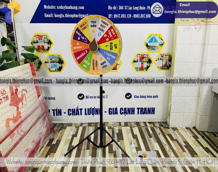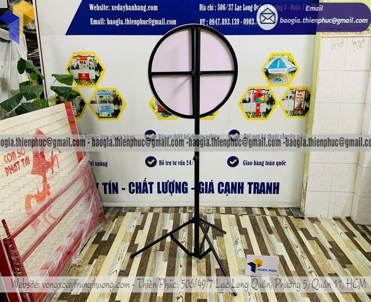 Mẫu vòng xoay quảng cáo quay trúng thưởng dùng cho event - Xưởng sản xuất & Công Ty Thiên Phúc là xưởng chuyên nhận sản xuất - gia công - thiết kế - in ấn nhiều mẫu vòng quay xoay quảng cáo trúng thưởng với nhiều kích thước khác nhau từ để bàn đến cỡ lớn. Thiết kế logo và in ấn theo yêu cầu khách hàng, miễn phí. Giá rẻ nhất thị trường dao động chỉ từ 850.000đ/cái - 1.300.000đ/cái trở lên đối với mẫu vòng quay chân xếp đứng. Đặt hàng số lượng lớn chiết khấu ưu đãi. Liên hệ ngay Thiên Phúc để nhận được báo giá chi tiết và nhanh nhất