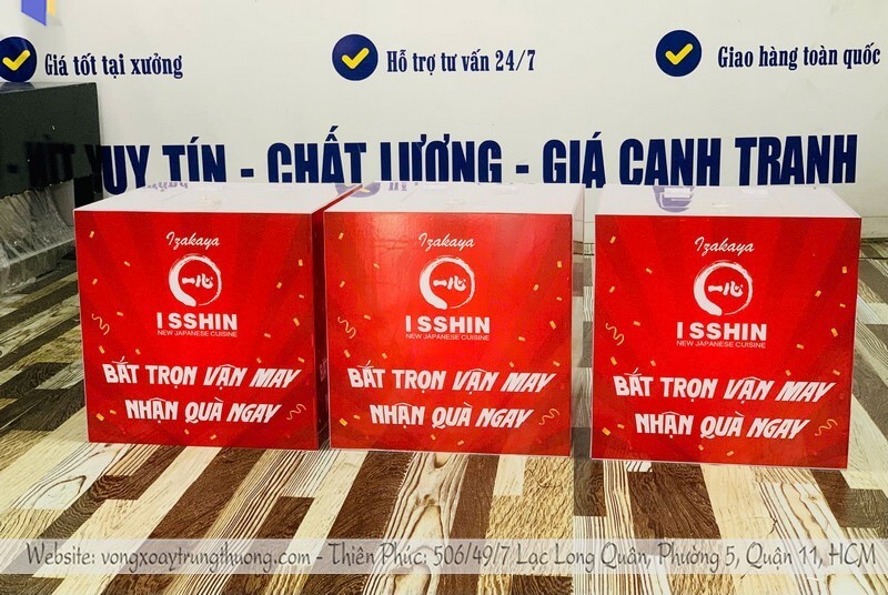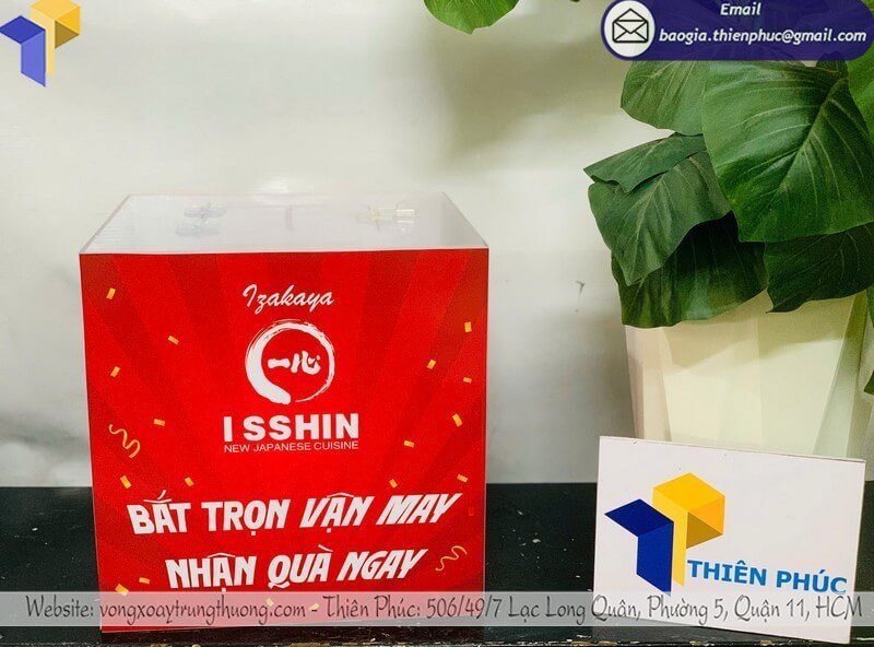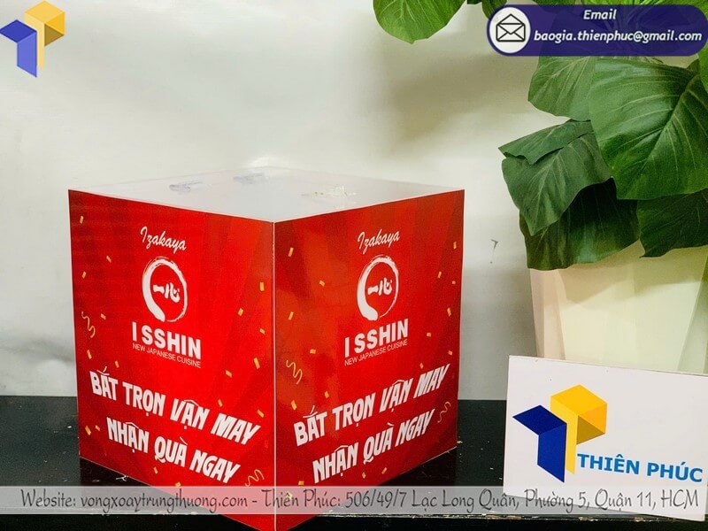 Giá tham khảo hiện nay dao động chỉ từ 480.000 VNĐ cho hộp nhỏ và 800.000 VNĐ cho hộp kích thước trung, tùy mẫu logo thiết kế và in ấn – mức giá hợp lý để bạn có thể tổ chức minigame, rút thăm trúng thưởng hay tạo sân chơi hấp dẫn mà không lo vượt ngân sách. Chất liệu mica trong suốt cao cấp, bền bỉ, cùng thiết kế tiện lợi giúp bạn vừa tiết kiệm chi phí, vừa đảm bảo tính chuyên nghiệp cho mọi sự kiện.