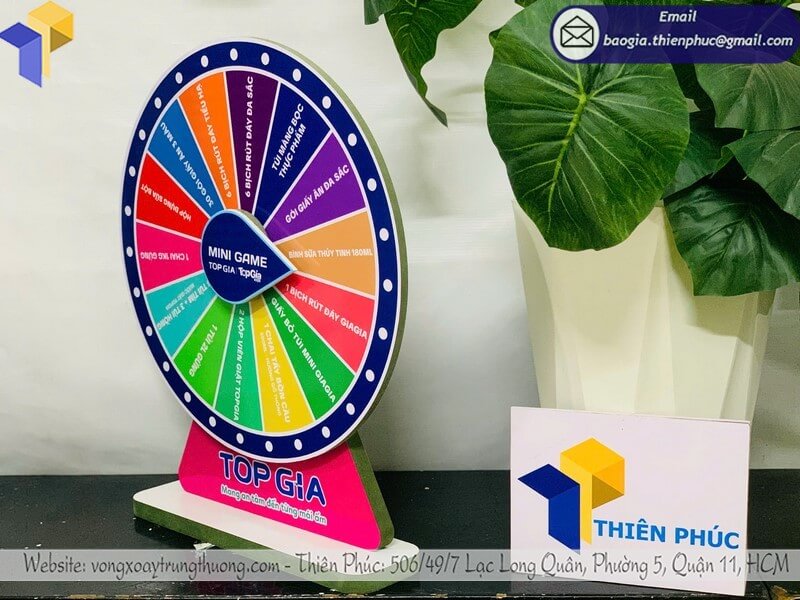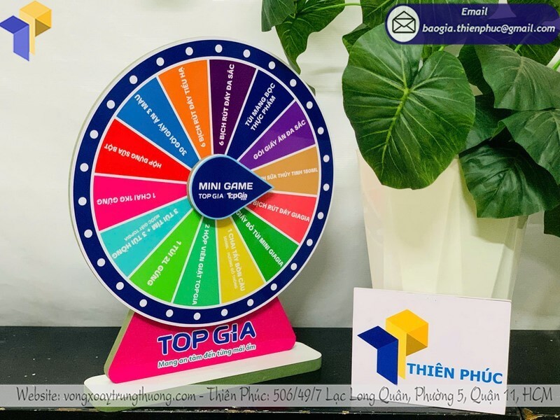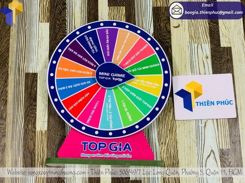 Tên sản phẩm: Mua vòng xoay minigame may mắn bằng gỗ để bàn rẻ với logo nhãn hiệu TOP GIA