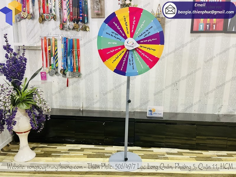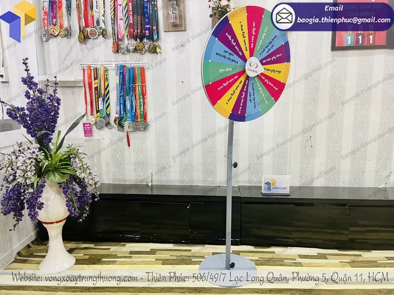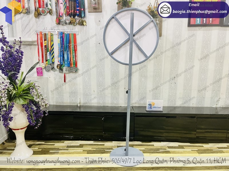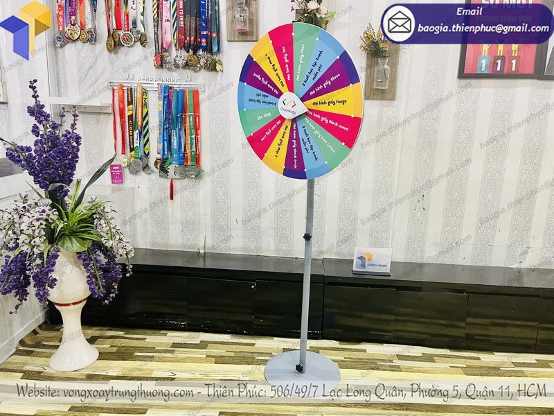 vòng quay trúng thưởng mặt được làm bằng tấm fomex như trò chơi chiếc nón kỳ diệu. Vòng quay random chân đứng dùng trong số chương trình game show, trong các sự kiện bốc thăm trúng thưởng, dịp khai trương của hàng, ngày lễ 8/3, 20/10 lễ tình nhân; marketing pr sản phẩm mới, các chương trình quay số trúng thưởng, quảng cáo khuyến mãi quà tặng ...