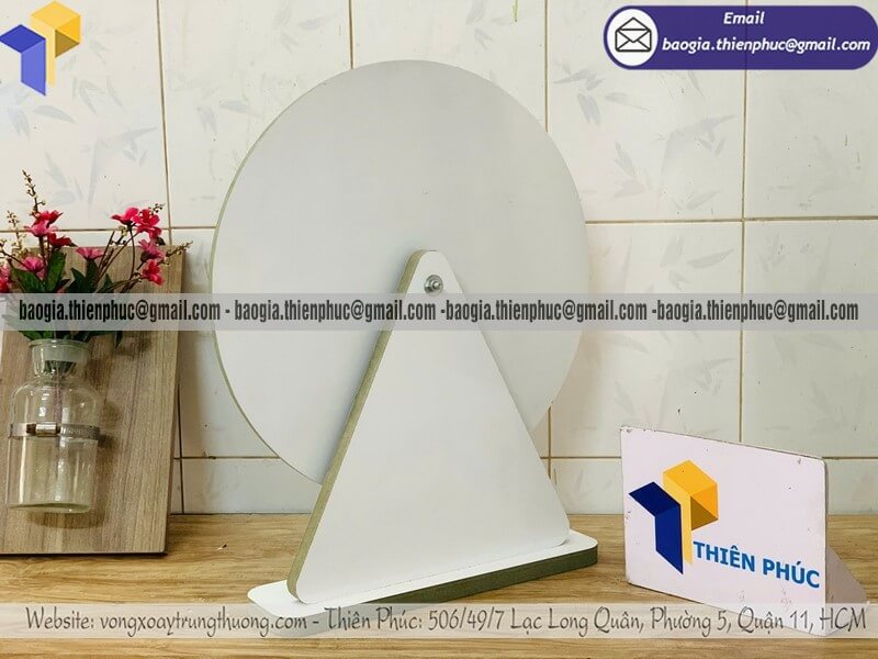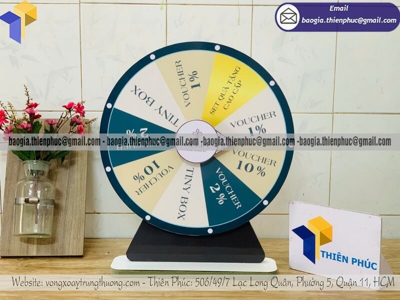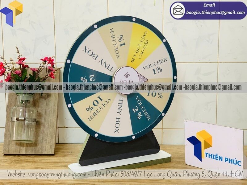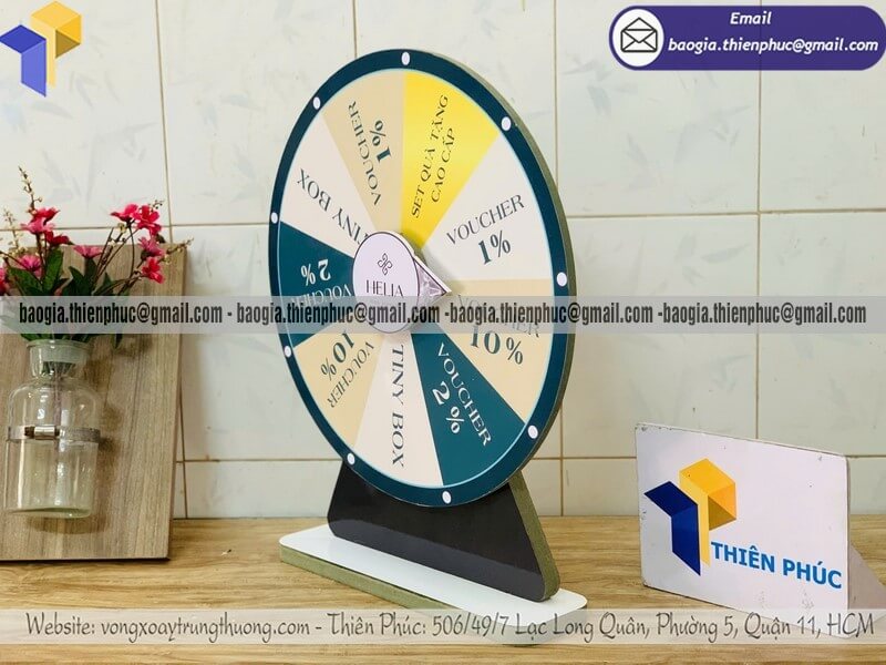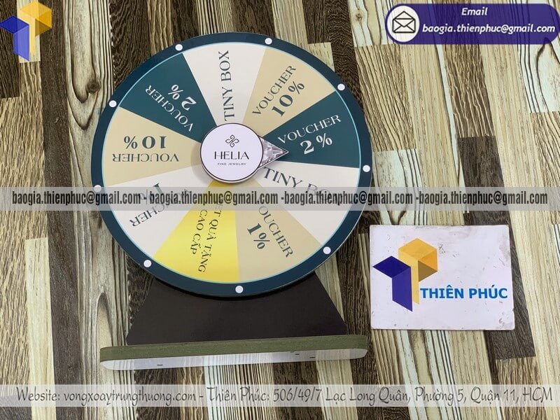 Nhận làm vòng xoay luckydraw quay thưởng bằng gỗ - Xưởng sản xuất và Công Ty Thiên Phúc là xưởng chuyên cung cấp và gia công nhiều mẫu vòng xoay để bàn làm bằng gỗ có sẵn tại xưởng với đường kính phổ biến tại xưởng 30cm, 40cm. Thiết kế logo các ô quà tặng, nhãn hàng, thương hiệu miễn phí; theo yêu cầu khách hàng. Báo giá rẻ nhất - cạnh tranh nhất trên thị trường dao động chỉ từ 400.000đ/cái đến 600.000đ/cái trở lên cho mẫu cơ bản nhất. Hãy liên hệ ngay xưởng sản xuất Thiên Phúc để nhận được báo giá chi tiết nhất và nhanh chóng. Hỗ trợ xuất hóa đơn VAT cho doanh nghiệp, công ty.