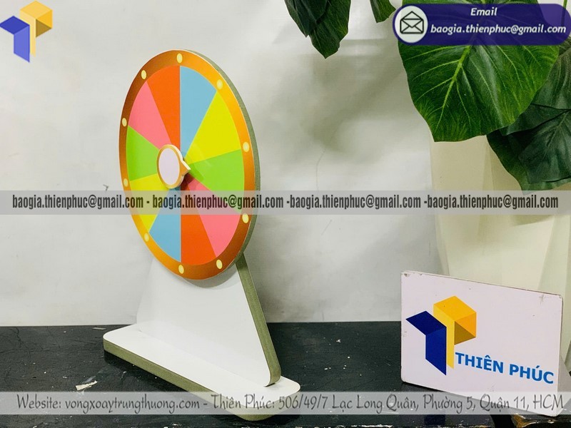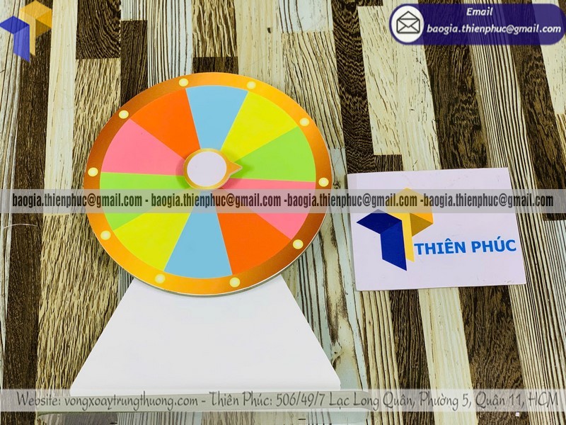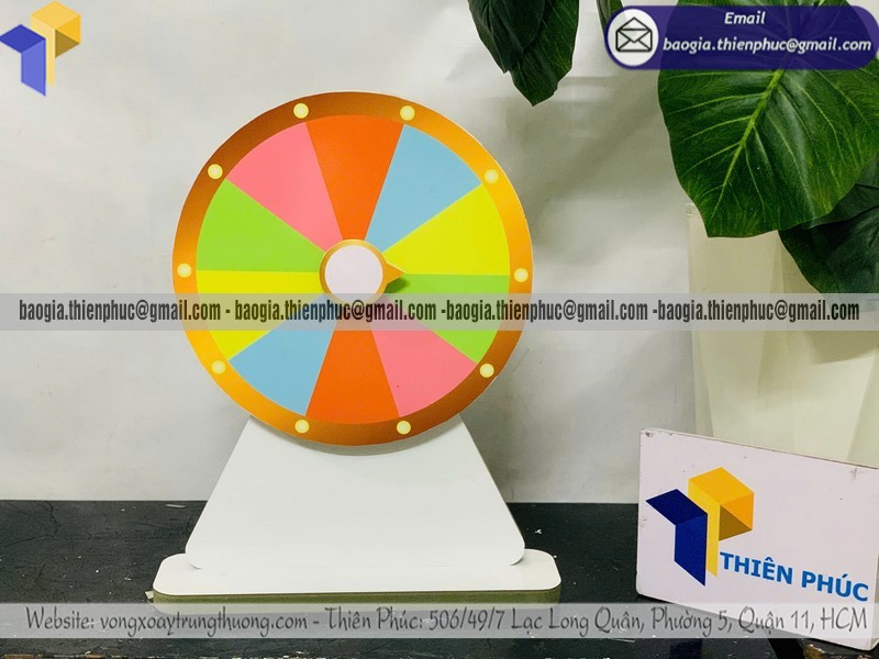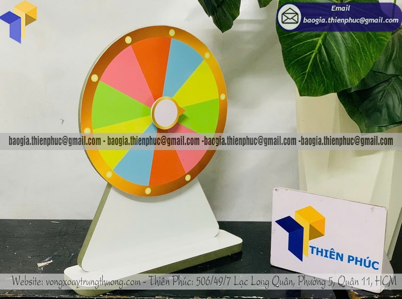 Nơi bán vòng xoay để bàn trúng quà minigame lấy liền - Xưởng sản xuất & Công Ty Thiên Phúc là xưởng chuyên nhận đặt làm nhiều mẫu vòng xoay để bàn bằng gỗ với hơn 10 năm kinh nghiệm và có nhiều mẫu có sẵn tại xưởng. Với kích thước vòng xoay có đường kính là 30cm, 40cm. Xưởng còn thiết kế logo, ô quà trúng hoàn toàn miễn phí, theo yêu cầu khách hàng. Dao động rẻ nhất chỉ dưới 1 triệu trở xuống. Hỗ trợ xuất hóa đơn VAT doanh nghiệp - công ty.