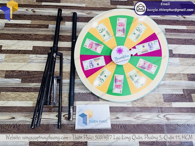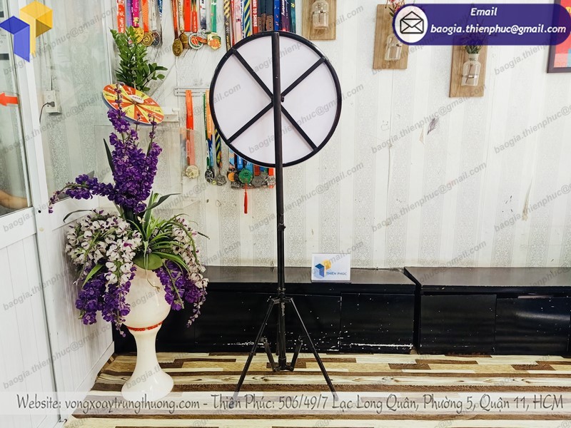 vòng quay sự kiện may mắn được làm từ chất liệu khung sắt và dán decal là chính, có thể lắp ráp dễ dàng gọn nhẹ vì có chân đế tròn tháo rời dễ di chuyển. Quý khách chỉ cần cung cấp thông tin thiêt kế trên vòng xoay may mắn mà mình muốn thực hiện ý tưởng, chúng tôi sẽ hỗ trợ thiết kế file cho quý khách nếu trường hợp quý khách chưa có file để sản xuất.