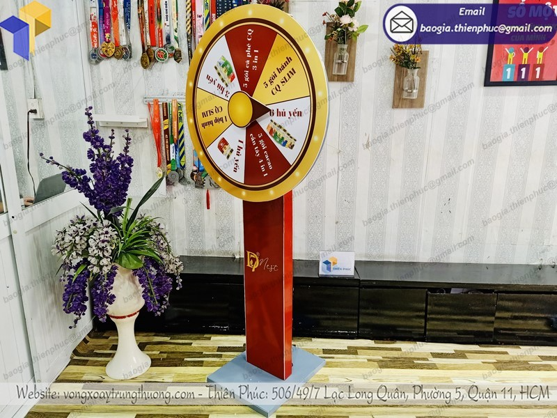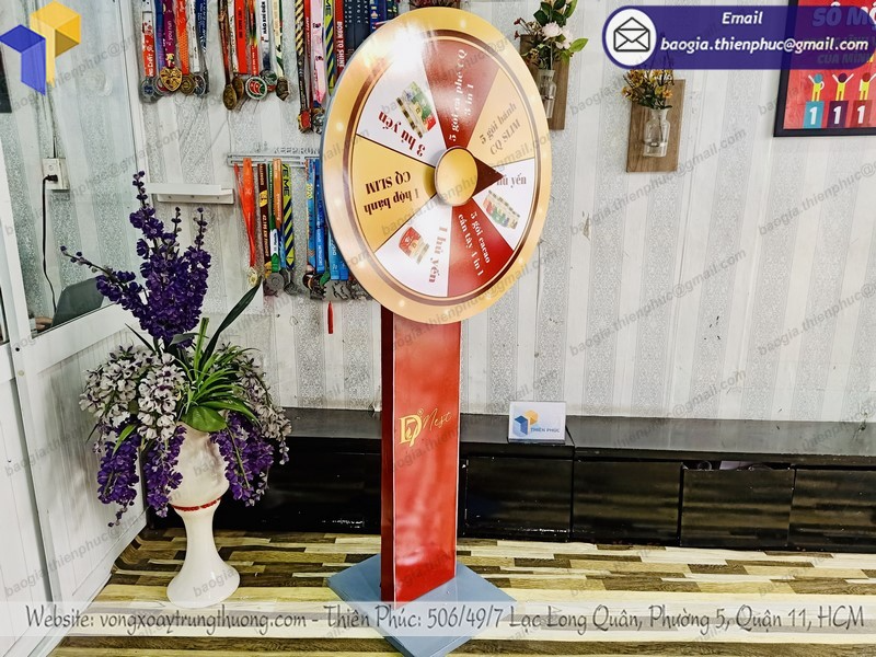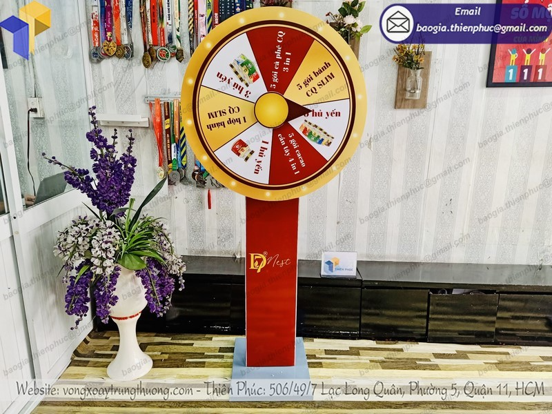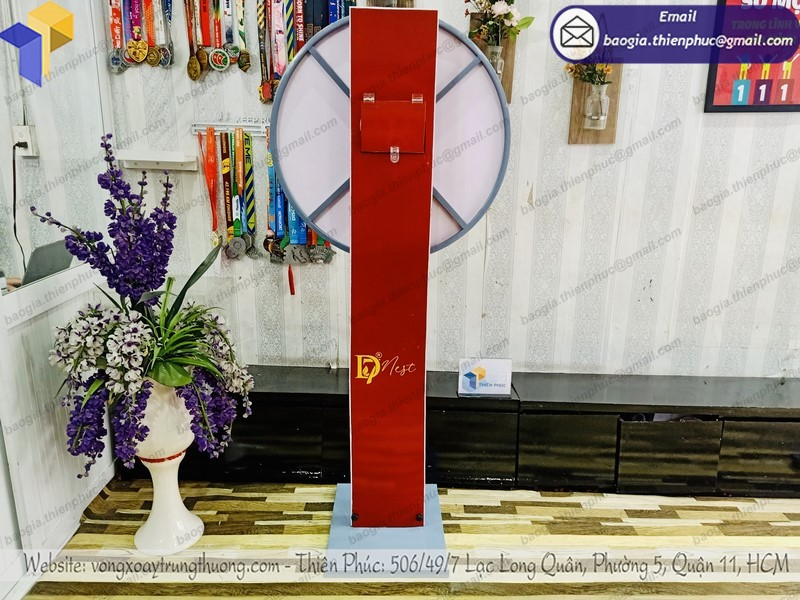 Tri ân khách hàng băng vòng quay thân trụ in logo trúng thưởng