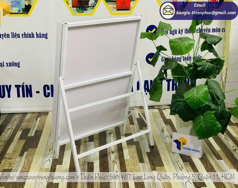 Thường có chân đế hoặc khung đứng, ổn định và an toàn. Một số mẫu thiết kế có thể tháo lắp để dễ vận chuyển. Bảng có thể in logo, slogan thương hiệu trên khung hoặc backdrop phía sau.