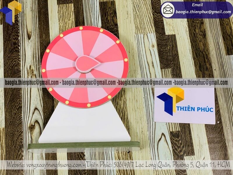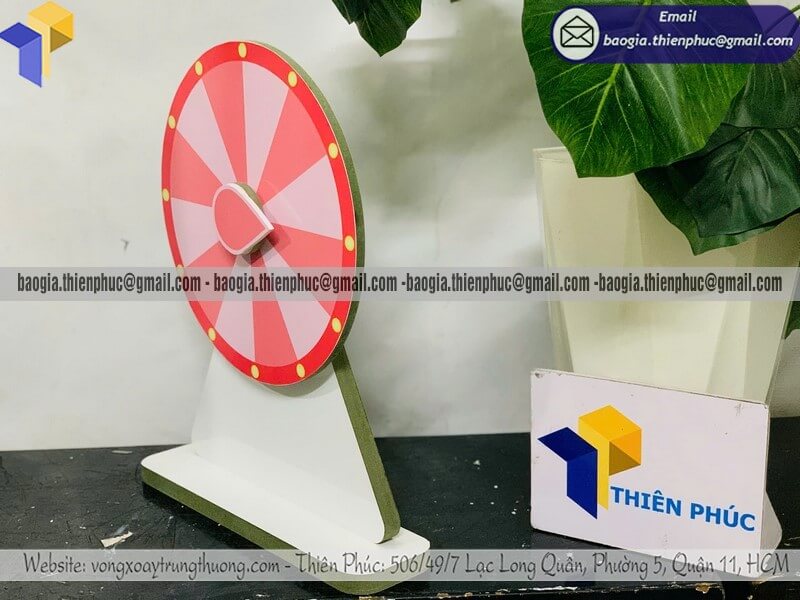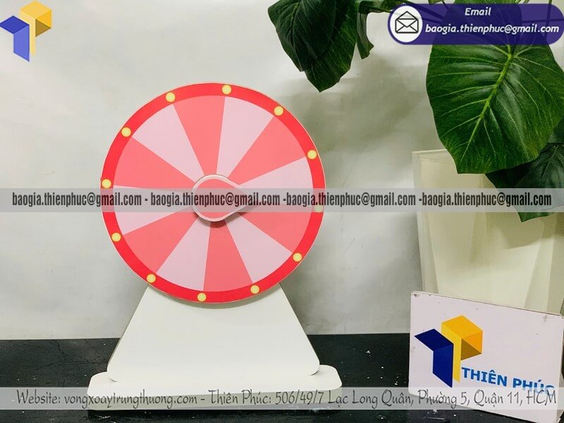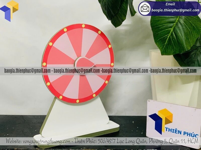 Ngoài ra, kích thước vòng quay may mắn tự ghi cũng rất đa dạng: từ loại để bàn, loại trung bình cho gian hàng, đến vòng quay cỡ lớn dùng cho sân khấu sự kiện. Tùy mục đích sử dụng, khách hàng có thể đặt làm theo kích thước và màu sắc phù hợp nhận diện thương hiệu.