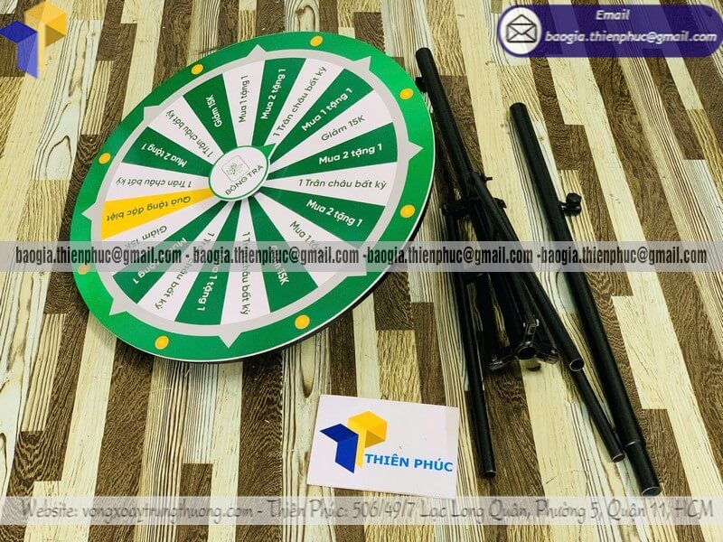 Giá phụ thuộc vào nhiều yếu tố như đường kính vòng quay, số ô giải thưởng, loại chân đế, in ấn logo, phụ kiện đi kèm và tiến độ sản xuất (đơn gấp hay thường).