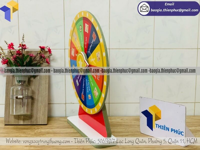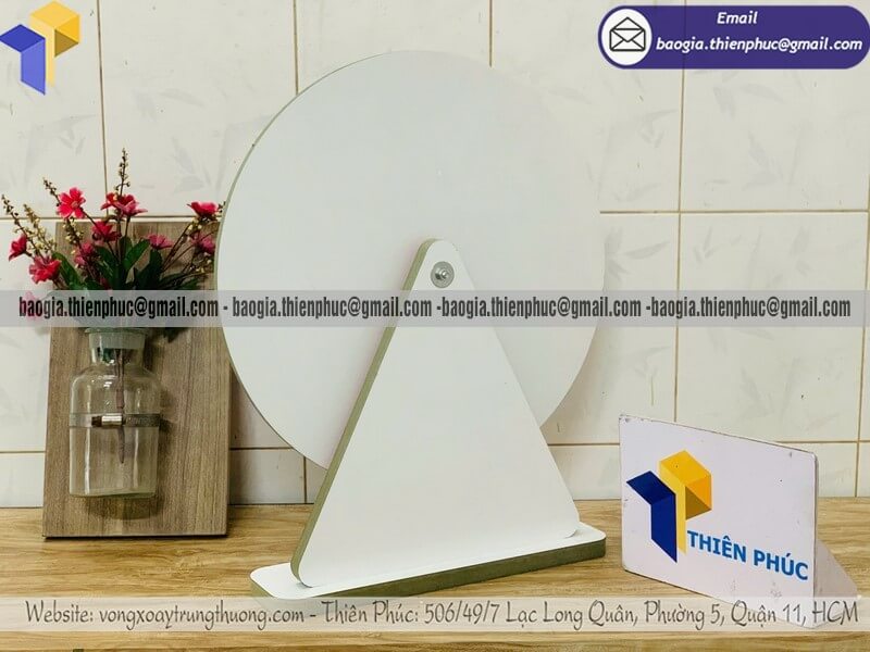 Vòng xoay số bằng gỗ để bàn quay trúng quà khuyến mãi - Xưởng sản xuất và Công Ty Thiên Phúc là xưởng chuyên cung cấp và gia công nhiều mẫu vòng xoay để bàn làm bằng gỗ có sẵn tại xưởng với đường kính phổ biến tại xưởng 30cm, 40cm. Thiết kế logo các ô quà tặng, nhãn hàng, thương hiệu miễn phí; theo yêu cầu khách hàng. Báo giá rẻ nhất - cạnh tranh nhất trên thị trường dao động chỉ từ 400.000đ/cái đến 600.000đ/cái trở lên cho mẫu cơ bản nhất. Hãy liên hệ ngay xưởng sản xuất Thiên Phúc để nhận được báo giá chi tiết nhất và nhanh chóng. Hỗ trợ xuất hóa đơn VAT cho doanh nghiệp, công ty.
