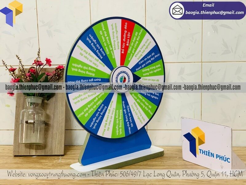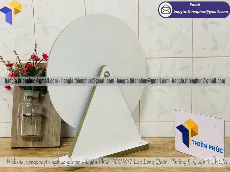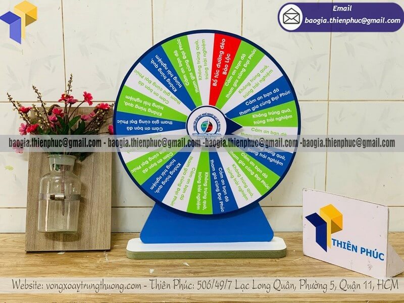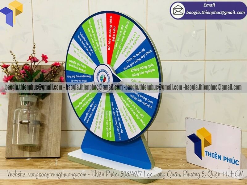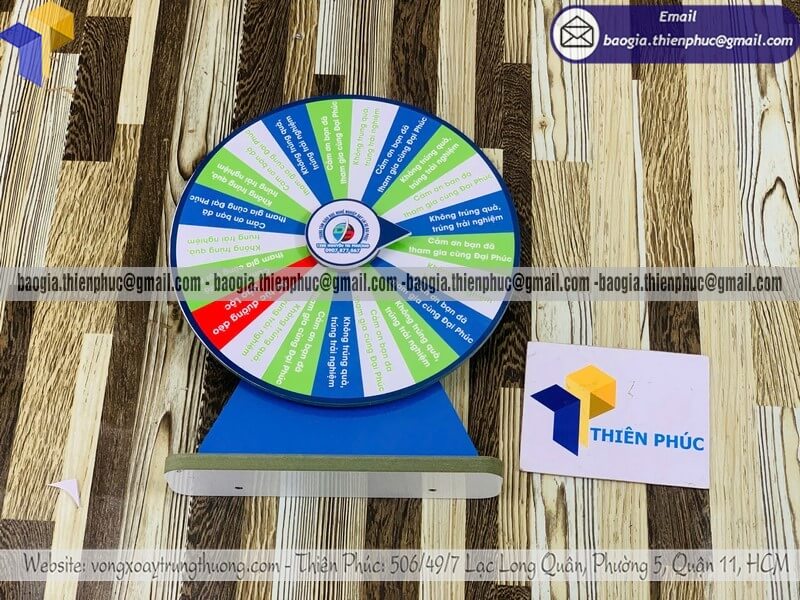 Xưởng chuyên làm vòng xoay thưởng giải trí bằng gỗ - Xưởng sản xuất và Công Ty Thiên Phúc là xưởng chuyên cung cấp và gia công nhiều mẫu vòng xoay để bàn làm bằng gỗ có sẵn tại xưởng với đường kính phổ biến tại xưởng 30cm, 40cm. Thiết kế logo các ô quà tặng, nhãn hàng, thương hiệu miễn phí; theo yêu cầu khách hàng. Báo giá rẻ nhất - cạnh tranh nhất trên thị trường dao động chỉ từ 400.000đ/cái đến 600.000đ/cái trở lên cho mẫu cơ bản nhất. Hãy liên hệ ngay xưởng sản xuất Thiên Phúc để nhận được báo giá chi tiết nhất và nhanh chóng. Hỗ trợ xuất hóa đơn VAT cho doanh nghiệp, công ty.