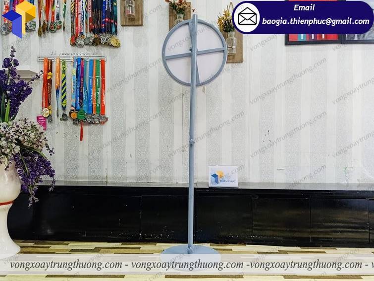 Thông thường các mẫu vòng quay kì diệu chân đứng tại Thiên Phúc được thiết kế hình tròn được trang trí bằng decal sắc nét và ở giữa vòng tròn là một chiếc kim làm điểm dừng. Phần khung được làm bằng sắt chắc chắn với bốn kiểu khung chính là chân sắt, để bàn, chân xếp và chân trụ; tất cả đều tháo lắp được một cách dễ dàng. Ưu điểm chính là có độ bền tốt và sử dụng được lâu dài vì được phun thêm một lớp sơn mạ kẽm chống gỉ. Như vậy những chiếc vòng quay vừa có vẻ ngoài đẹp mắt lại được bảo vệ khỏi các nguy cơ bị gỉ sét.